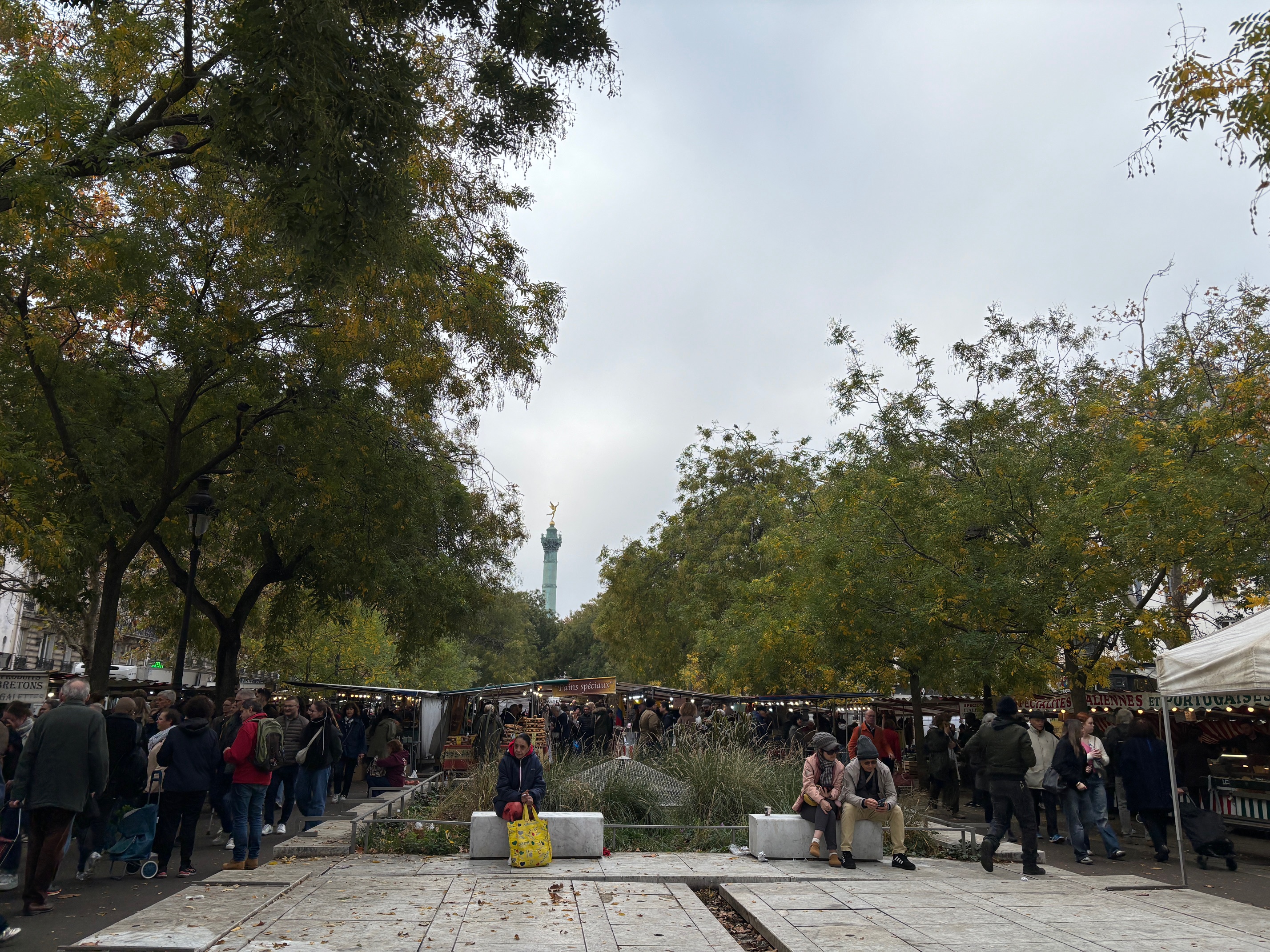 On Sundays until 2 p.m., there is a market at Place de la Bastille. Tourists, Parisians, pensioners, children, wealthy and less wealthy people all shop here. Crabs crawl in buckets, couples slurp oysters, and children pull tired arms toward flashing plastic cars. What happens here above all is that people who do not know each other talk, strike up conversations, negotiate, and come to agreements. They experience and create a shared situation. They create reality. Prices here are lower than in any supermarket, but you have to look each other in the eye and, above all, talk. Gestures, basic French, or even just English are gladly accepted. Afterward, any supermarket shopping feels contactless and like a loss of time and human warmth.